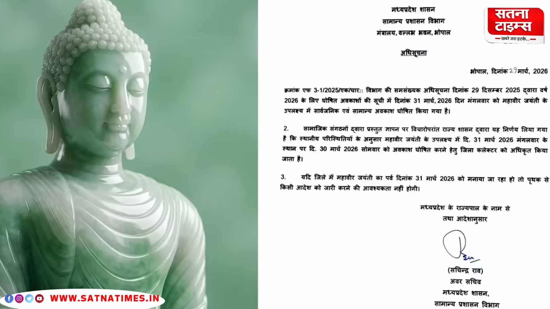MP में महावीर जयंती की छुट्टी पर बड़ा फैसला: 31 की जगह 30 मार्च को भी मिल सकेगा अवकाश; सरकार ने जिला कलेक्टरों को किया अधिकृत